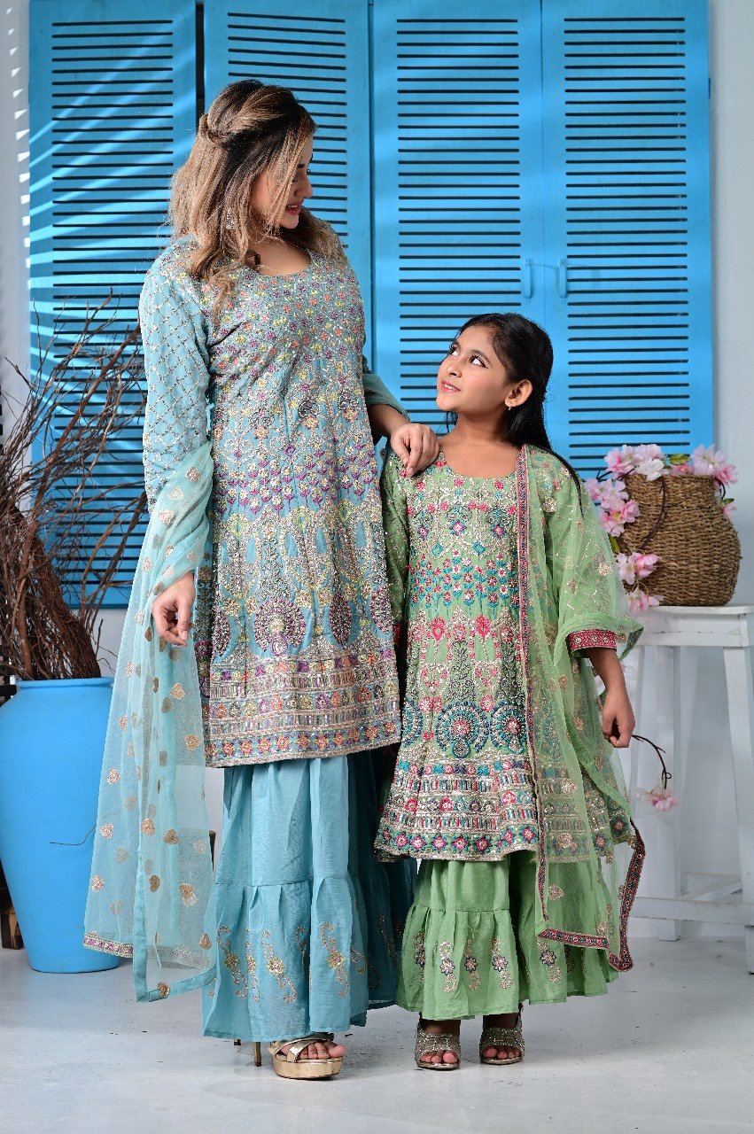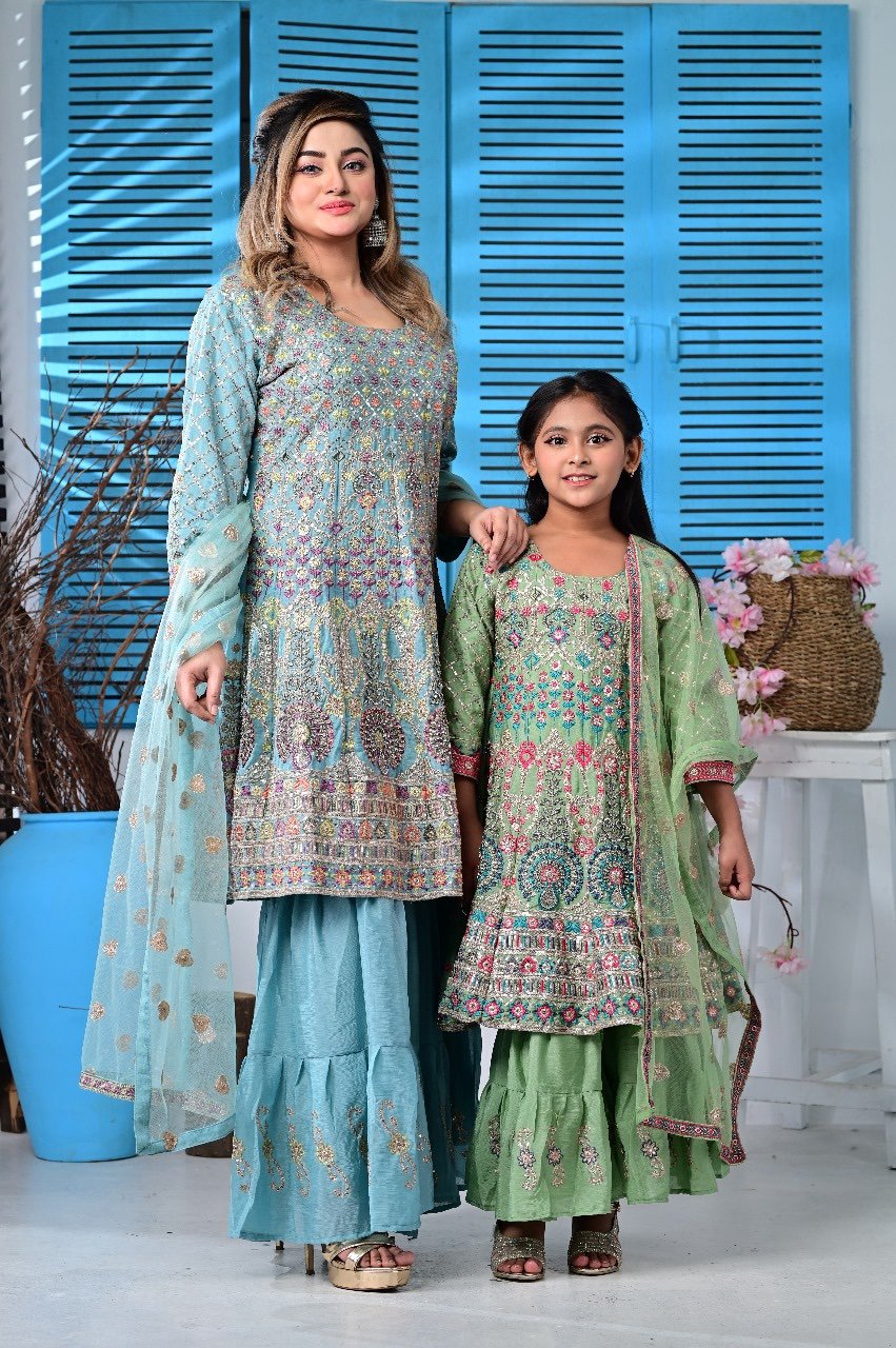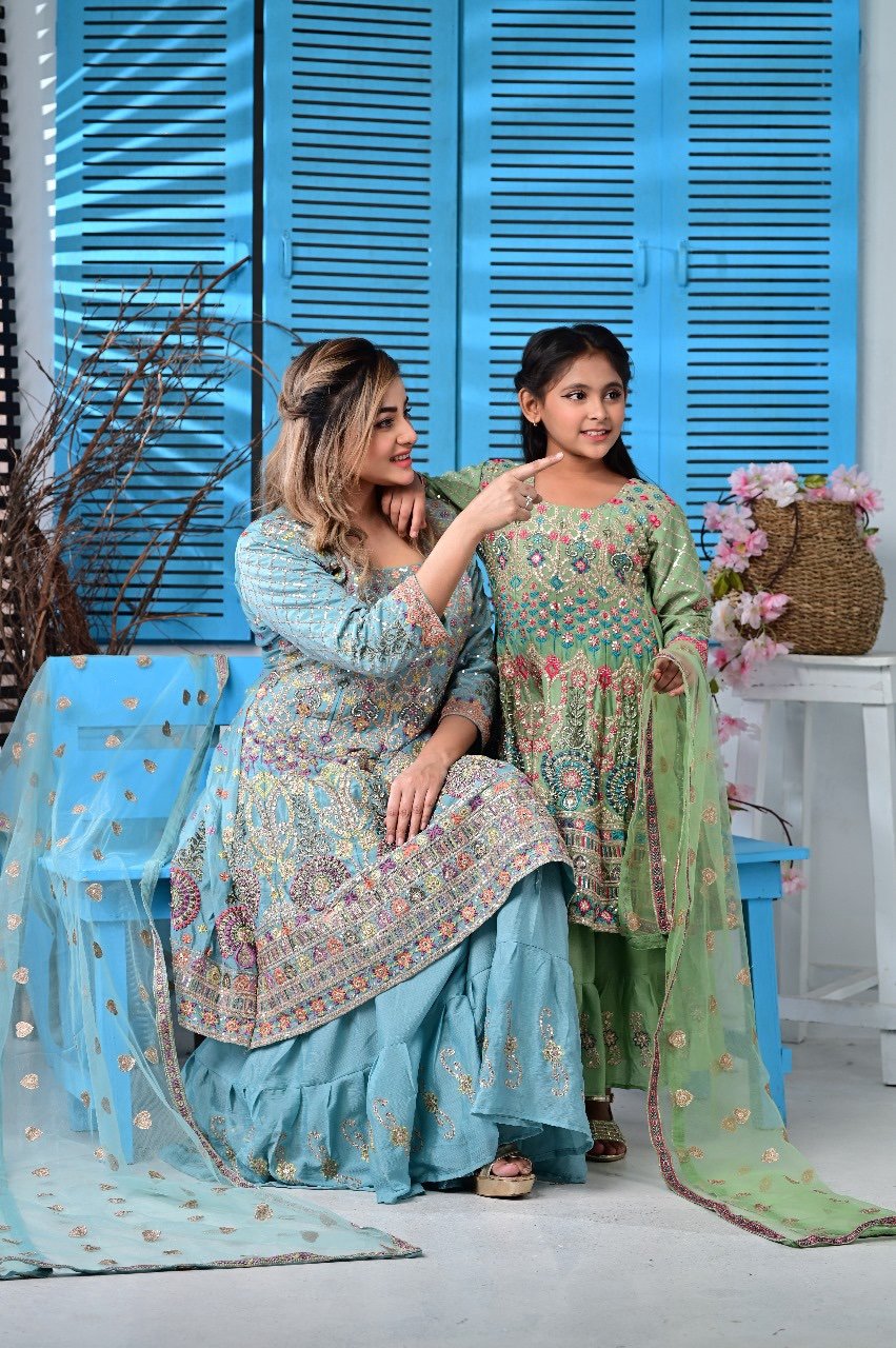 Celebrate your special moments with our stunning Big & Baby Combo Gown Set – crafted from premium Indian fabric with beautiful embroidery and zari work.